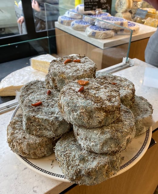 He combined the words Rove and thyme (thym in French) to create Rovethym. It is shaped by hand into a distinctive quenelle shape that is adorned with a sprig of thyme, so very easy to spot at the fromagerie. This is a young, unpasteurized cheese, best eaten when itโs just a few weeks old. It has a very dense and sticky texture with notes of citrus, thyme and other aromatic herbs. I love to eat it drizzled with honey!