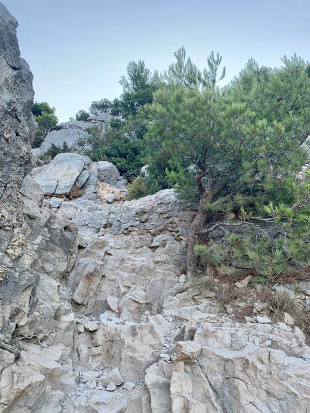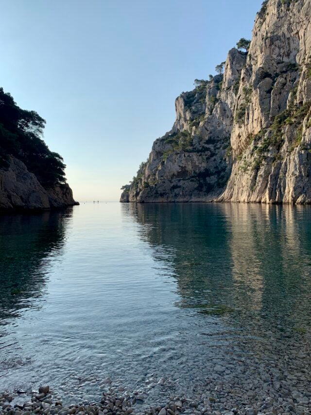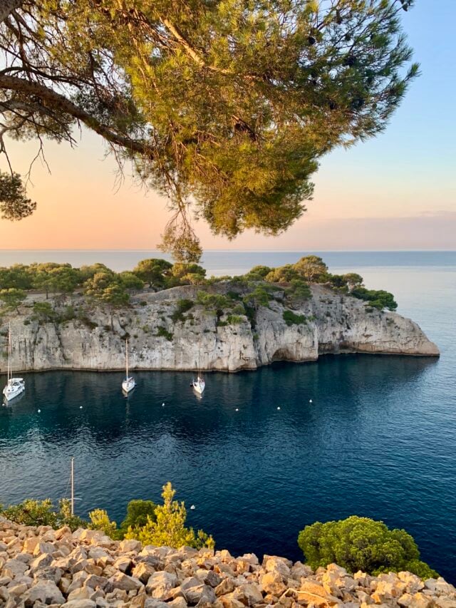 Knowing how hot it would be in the middle of the day, my teenager and I set out to hike the trail to Calanque dโEn Vau at 6am, while most people were still tucked up in bed (except my husband, who was definitely up and looking after the littles). We were almost immediately rewarded with breathtaking sunrise views as we approached Port Miou, a magnificent narrow harbor thatโs one kilometer (about 2 miles) long and has about five hundred ships anchored at any one point.ย