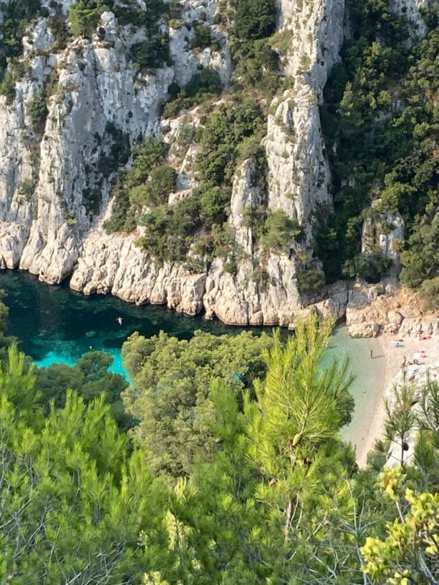 From there, the trail to Calanque dโEn Vau gets increasingly steep and at one point we were sure we had made a wrong turn as we scrambled down incredibly steep rocks, and I quietly pictured what my husband would say when the search party found us. But we were on the right track, and arrived just before the sun hit the small cove, with high cliffs towering on either side, and immediately refreshed ourselves by diving into the cold, clear water (donโt be surprised if the fish try and nibble your feet). By the time we hopped out and set up our towels the sun was streaming in and the water changed to shades of blue that I will never forget. On the hike back (take the option signposted โscenic routeโ on the way back for the best views) we passed a few people who were regretting their footwear choices (you definitely need to wear running or hiking shoes) and the path was increasingly crowded. As we reached the entrance to the national park people were streaming in, and we were very happy with our choice to go so early.