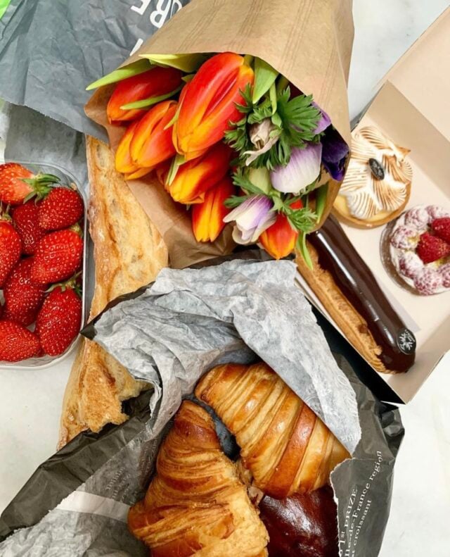 When my usual circuit of the market is done, I trundle home with my packed trolley, ready to jump back into the everyday chaos that is a family of 5 plus a dog. Because I usually only visit once a week (although it is there Saturday, Tuesday and Thursday) as soon as Iโm home I pop some of the meat into the freezer to keep it fresh for when I want to use it, and prepare the vegetables where possible because if I donโt do it straight away, they will sit in the fridge begging for attention until they go limp. My simple prep routine is as follows: radishes, leeks and celery get trimmed and washed. Beetroot gets wrapped up in foil to steam in the oven the next time I turn it on. Sweet potato, pumpkin and butternut squash get peeled and chopped, along with cauliflower and anything that feels like โeffortโ to prepare when there are tired children under my feet, hungry for their dinner. Everything sits in bowls in the fridge ready to roast in the oven or simmer in a pan for easy midweek meals. Potatoes, onions, shallots, garlic and carrots go into their drawer in the fridge, still dirty, ready to be called up when needed, and fruit gets rinsed and goes into the big bowl on the bench to brighten up our white kitchen. Then we sit back and look at the beautiful flowers while enjoying our lunch, finishing up with French cheeses and a pastry from the bakery.