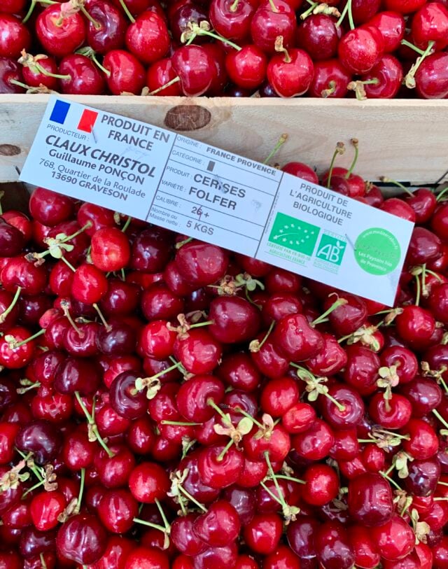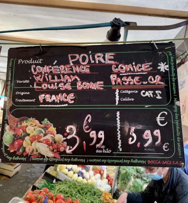 Each product should be labeled with a sign that will tell you where itโs from, which can help you make decisions on carbon footprint but also whether itโs in season (if itโs from France, chances are that it is). Biologique (or bio) means organic and varietรฉ is the variety of the fruit or vegetable. If you see Cat I and Cat II everywhere, they arenโt counting cats. This lets you know the quality of the produce and the range goes from Extra (perfect, restaurant quality) Category I (has very few flaws and you will not usually notice them) while Category II is the most common and you would usually be hard pressed to find fault with it. Fruit will sometimes be sold pour la confiture (to make jam) and means you can get a good deal on a box of squishy plums or dimpled cherries.