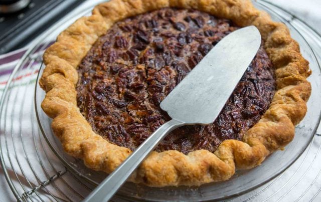 • Stir in the pecans and the chocolate chips then scrape the filling into the pie shell and bake for 30 to 35 minutes, or until the filling puffs up slightly but still feels slightly jiggly and moist in the center. Let pie cool completely before slicing.
