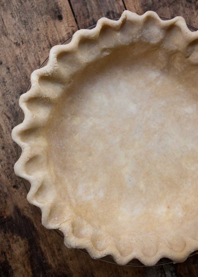 • Roll the dough on a lightly floured surface into a 12 inch (30cm) circle. Transfer the dough into a 9 inch (23 cm) pie plate letting the dough ease into the pan, rather than pressing it in. Tuck the overhanging dough underneath the top edge of the dough, to create a double width of dough, then crimp the edges and refrigerate until ready to fill.