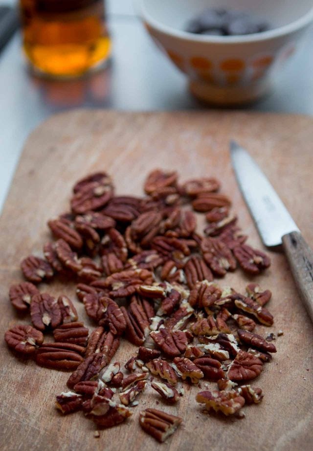 But Iโ€™ve gotten wiser over the years and brings things back with me from the States for this all-American dessert, and holiday tradition. I pack bags of pecans, although Iโ€™ve learned to adapt with other ingredients, using cassonade sugar from the natural food store for dark brown sugar, Golden syrup for corn syrup, and American bourbon, which I can find at my local supermarket. (France isnโ€™t just all about wine. The French like their whiskey, too.)
