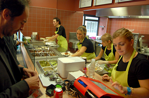 This lunch-only place is located near the business center of Paris. The energetic, friendly staff serves plump, respectable burritos, as well as soft tacos and salads, all available with various add-ins. (See photo, above.) Vegetarian options, too.