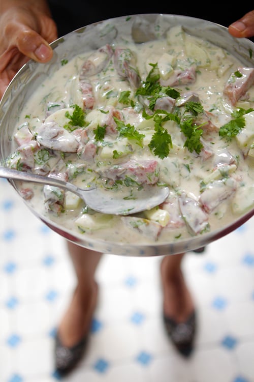 I was so excited to cook with Beena that I woke up that morning at 4:15am, partially because I was afraid I was going to oversleep and miss our 10 am rendez-vous, and partially because Iโm a little obsessive-compulsive aboutโฆwell, just about everything. But raita is so easy and so versatile that this is one dish that you โ nor I โ need to stress about.