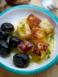 Thereโs also a debate and some say it should never have peppers or garlic in it (Iโm okay with folks leaving out the peppers), while others top it with strips of halloumi cheese, broiled to a chewy crunch. Which, now that Iโve had, Iโm not okay with anyone leaving off.