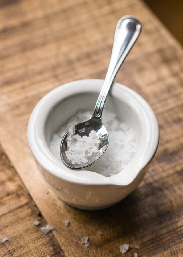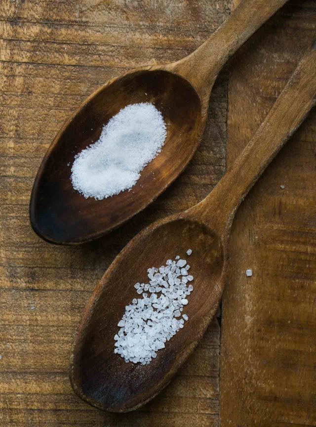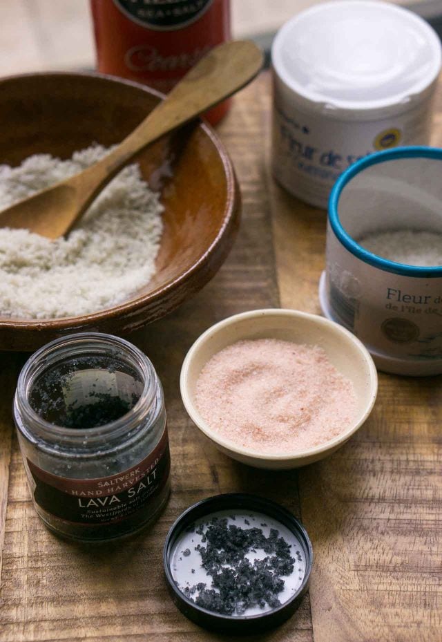I avoid fine or granulated salt, such as the one, above on the left. Whether the fine salt comes in a round canister for 79ยข at the supermarket, or itโs a fancy one labeled โFrench sea salt,โ or a pink one (shown at the top of the post), I find them all harsh and overly salty. If you want to taste the difference between fine table salt and flaky sea salt, put a few grains of sea salt on your tongue, taste it, then do the same with fine granulated table salt just afterward. You likely wonโt be buying table salt after that.