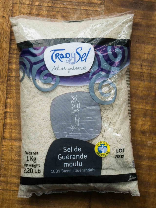 My everyday salt is sel gris, French grey salt, similar to the one above. Itโs inexpensive; most supermarkets in France sell a 1kg bag of it for around โฌ1,50 ($1.70). Itโs a great deal, but even if it was three times the price, which I see it sold for outside of France, it takes me about a year to go through the bag. So Iโm spending a few pennies a day to treat myself to good salt.