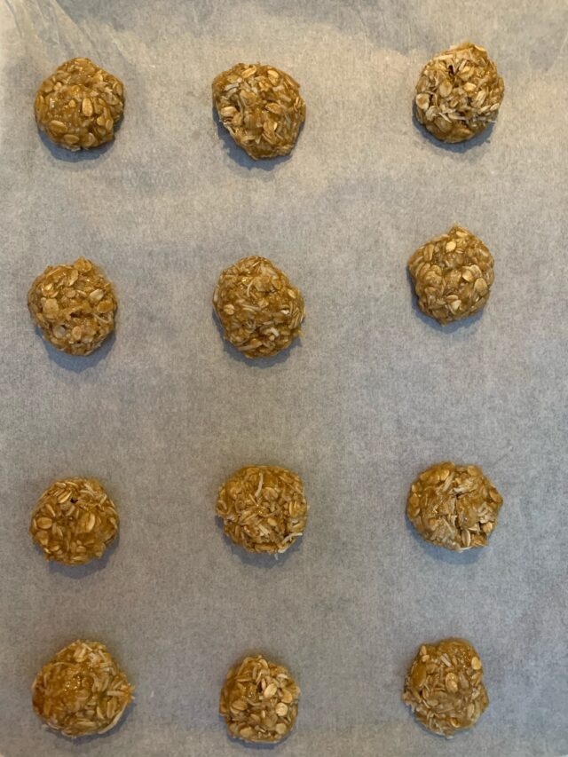 - Roll into golf-ball sized balls, place on the baking sheet and give them a light squash so they are flat on top. They spread quite a bit so make sure to leave room.