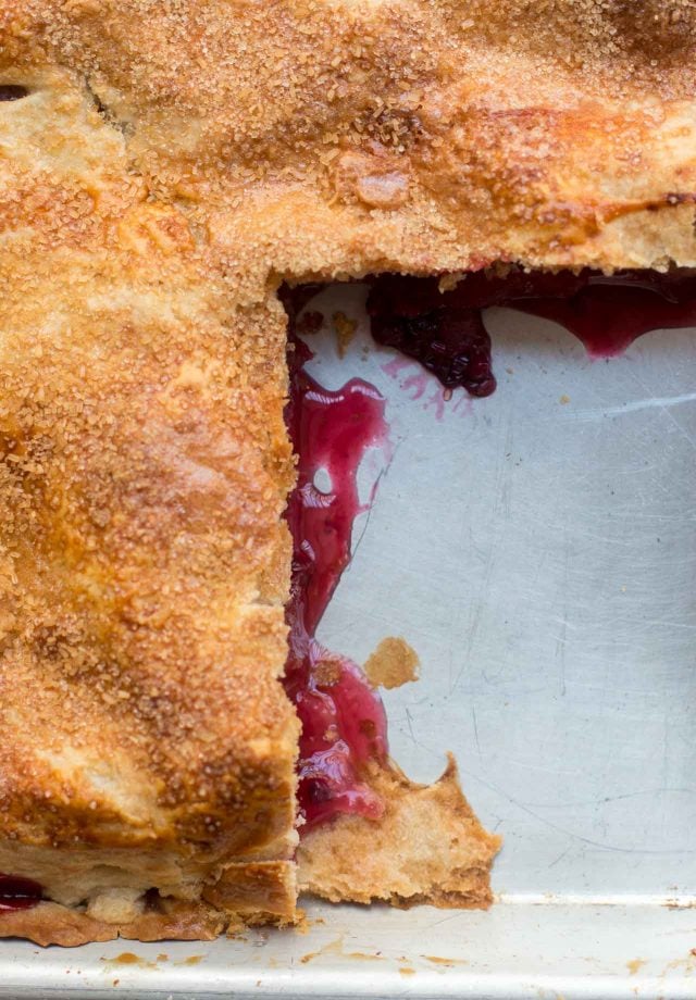 A neighbor gave me some Pink Lady apples that were leftover from a job he was working on that required apples (stylists often have to create scenarios months ahead for print publications), and although itโs not exactly apple season, being frugal and anti-gaspillage (anti-food waste) are year-round activities. I didnโt want to see them go to waste, so in spite of the withering temperatures, I decided to bake them all up in a big, generous slab pie.