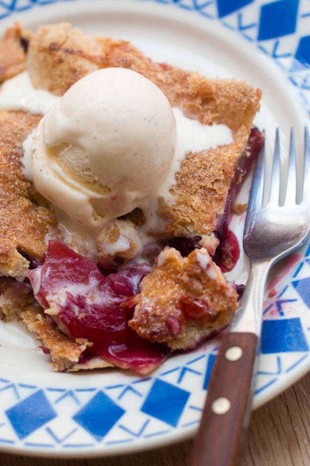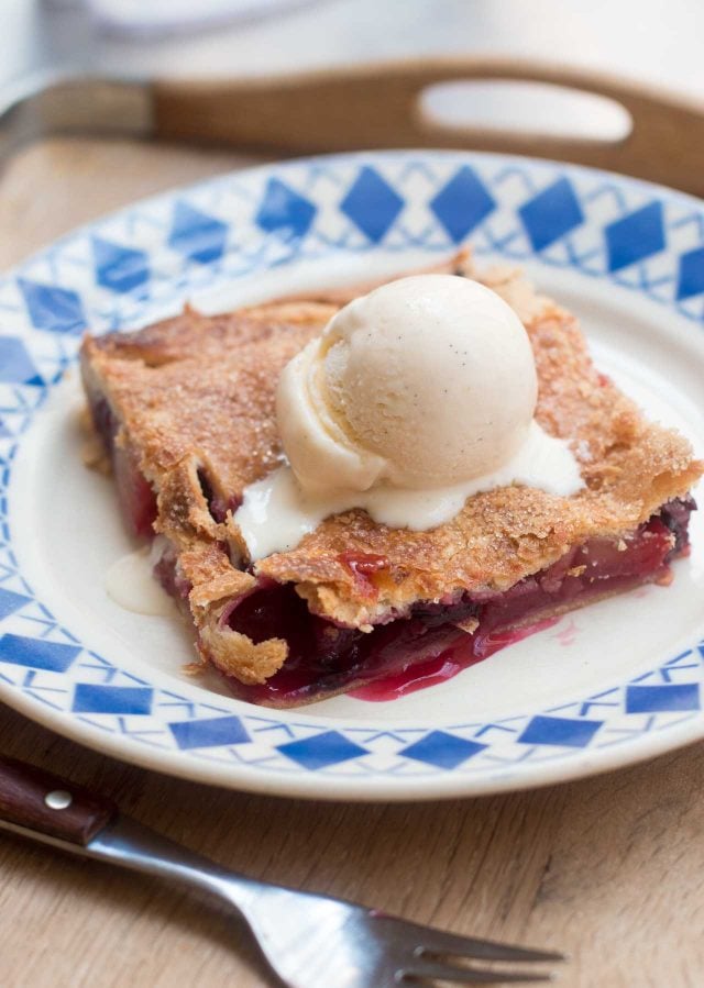 Working quickly while making and rolling the dough, and assembling the pie, I didnโt have any problems, although by the time it came to crimp the edges of the dough to enclose the apples, things were getting a little sticky, so I didnโt spend too much time on a fancy finish. Instead, I focused on getting the pie into the oven and 45 minutes later, pulled out a golden brown slab of buttery dough with a crunchy sugar topping, enclosing a thick, bubbly fruit filling, that was begging for a scoop of Vanilla Ice Cream. So I gave in.