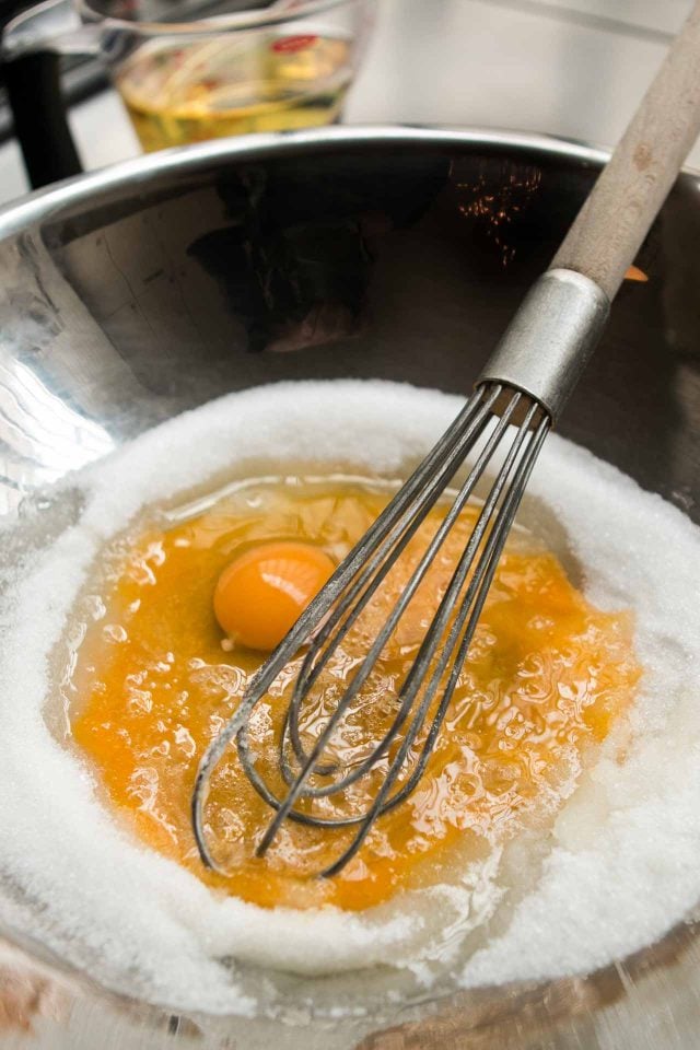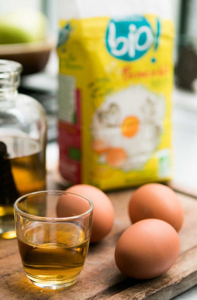 - In a large bowl, whisk together the sugar and the eggs. In a slow, steady stream - as if you were making mayonnaise - whisk in the oil, stirring constantly as you pour, to keep it emulsified. Whisk in the Calvados.
