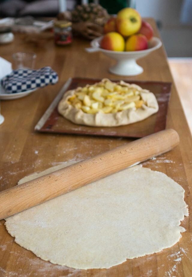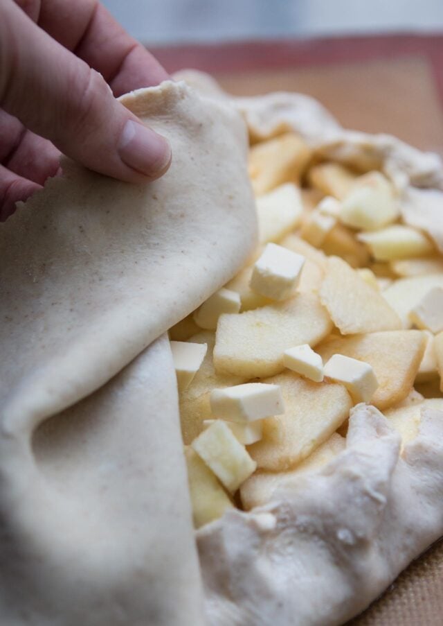 - Remove one piece of dough from the refrigerator and roll it out on a lightly floured countertop until it's a 14-inch (36cm) circle. Place the round of dough on the prepared baking sheet. (I fold it in half and work quickly to transfer it then unfold it on the baking sheet, but when I made this with Jacques, he rolled his dough around the rolling pin first, before moving it, and unrolling it on the prepared baking sheet.) Place the apples in an even layer over the dough leaving a 2-inch (5cm) exposed border. Distribute the diced butter bits over the apples. Fold the outside edges of the dough up and over to tuck in the apples.