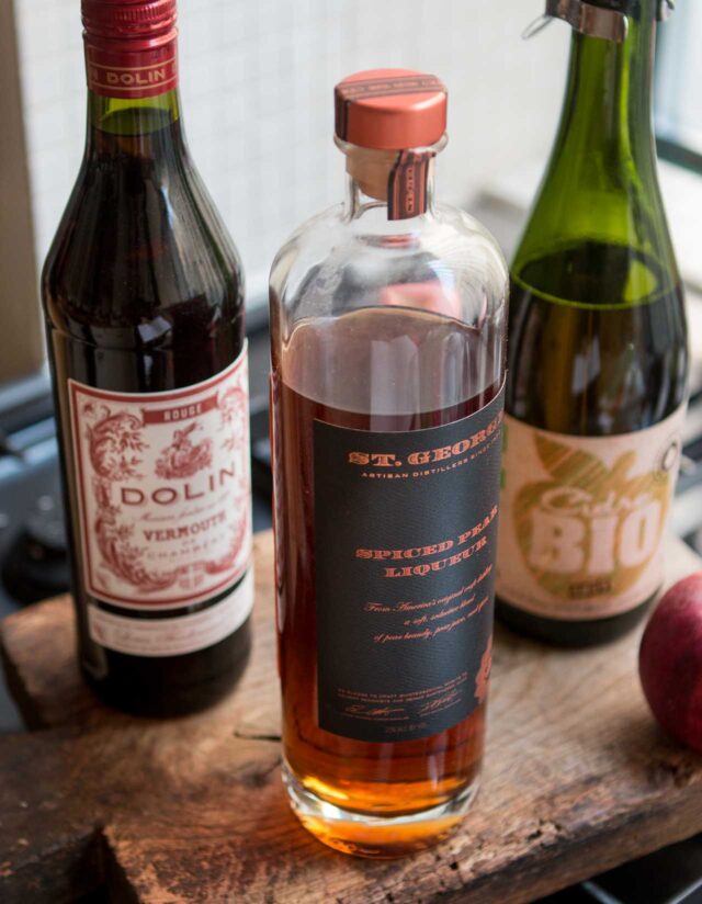 The other day I was thinking of cocktails that were fall and winter-friendly. Calvados (apple brandy) of course is always in season, but I also had a bottle of spiced pear liqueur from St. George Spirits in California on hand that has a lovely pear flavor mingled with a bouquet of spices, that Iโve been meaning to incorporate into a cocktail.