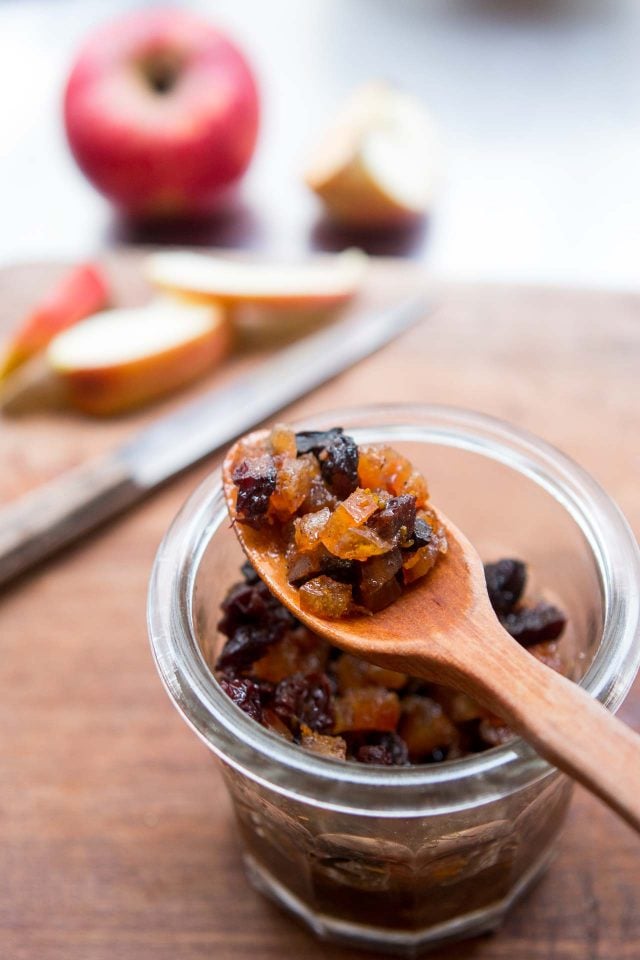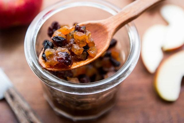 This simple mixture which mimics mincemeat very closely, and is even vegetarian, so everyone can indulge in dessert. The amount is perfect for adding to a bowl of sliced apples or pear destined for a pie or crisp. You can also fold it into just-churned vanilla ice cream, which is a great โ and surprising โ addition to a holiday dessert menu. The festively-spiced ice cream is even better with warm chocolate sauce ladled over it.