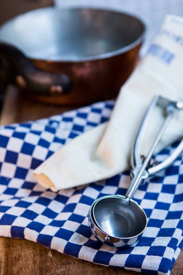 • Scrape the mixture into a pastry bag fitted with a wide plain tip (or use a springloaded ice cream scoop) and pipe the dough into mounds, evenly-spaced apart, making each about the size of a small cherry tomato.