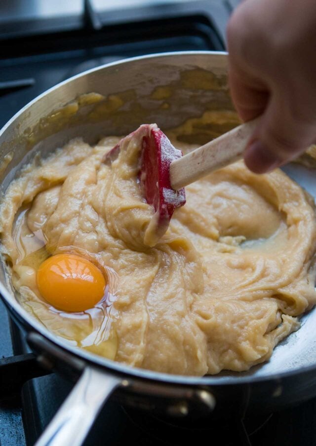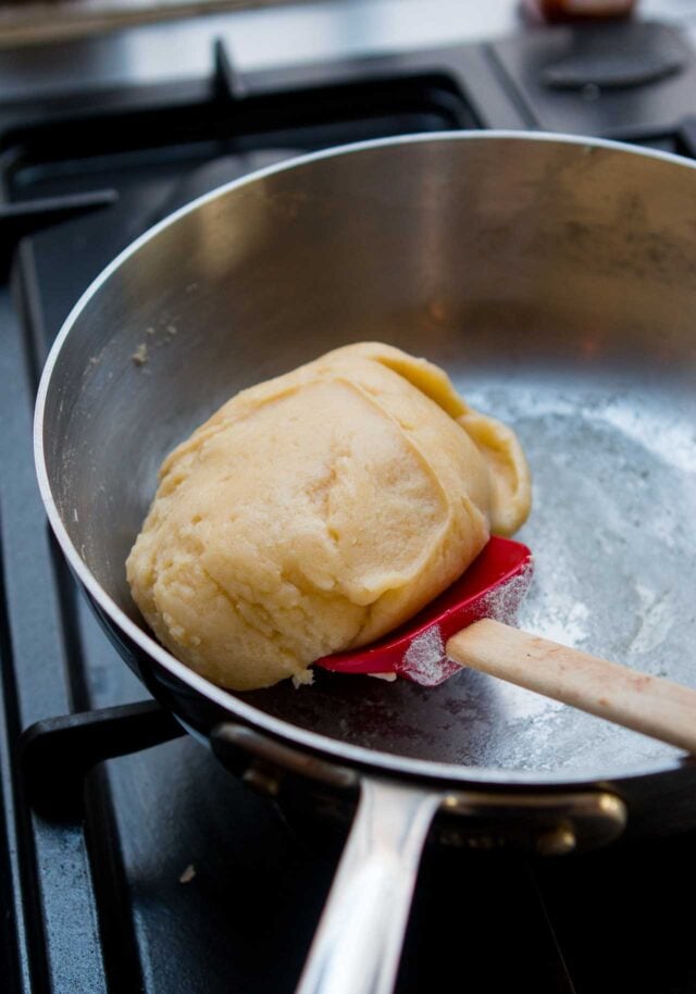 • Dump in the flour all at once and stir vigorously until the mixture pulls away from the sides into a smooth ball. Remove from heat and let rest two minutes, to cool it down a bit. At this point, you can scrape the dough into the bowl of a stand mixer fitted with the paddle attachment. If you don’t have a mixer, let it cool in the pan, stirring it a few times to let the heat escape.