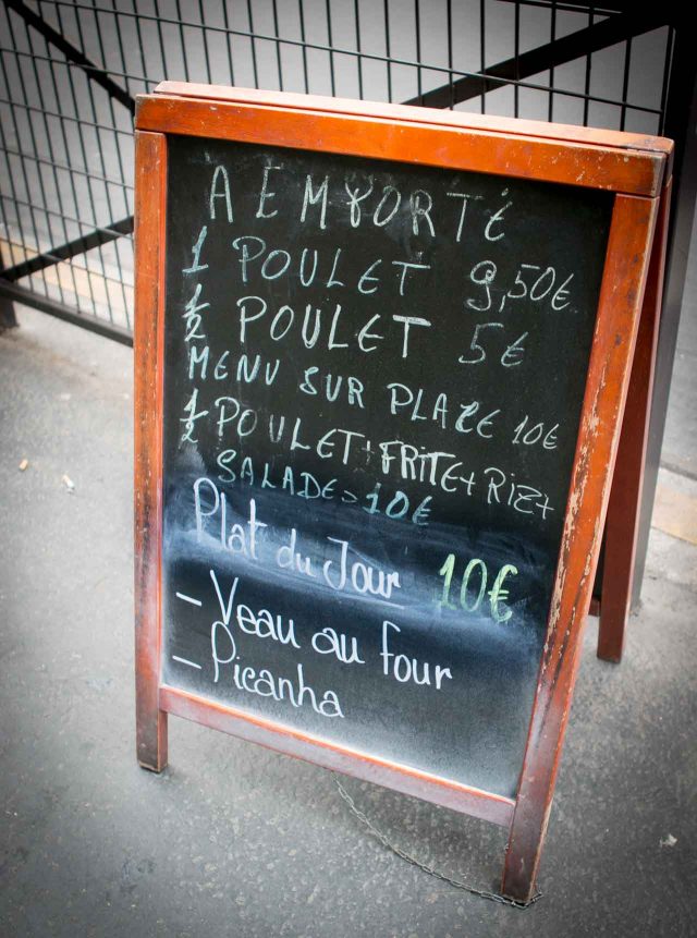 I donโ€™t think the menu changes and for about โ‚ฌ10 youโ€™ll get a half-chicken, French fries, a mound of rice, a little gesture of salad, and the fullest glass of red wine youโ€™ll ever come across. This is not a fancy place by any means, but Iโ€™ve always had a good time there. And the price is right.
