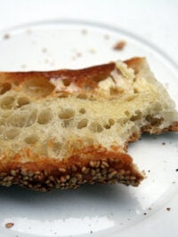 The interior should be pale-ivory colored and give off the scent of flour with a touch of yeast. The mie, or the interior, will be chewy and light-but-tough from a well-developed network of gluten. And it should make you happy when you exit the bakery, yank off the quignon, the little crusty end of the baguette, and stuff it in your mouth, which Parisians invariably do on their way home. (And I just know this is just asking for trouble, but itโs pronounced keen-yon.)