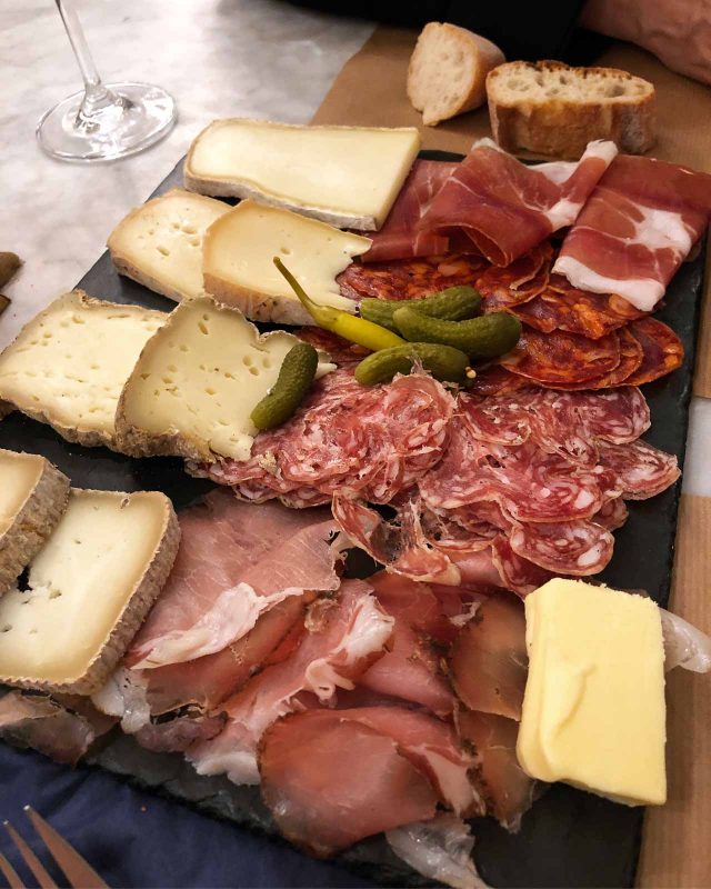 Further up the hill in Belleville, is La Cave de Belleville, a natural wine bar. Often these kinds of wine bars attract a hip crowd, who seems more interested in jumping out of their seats to grab a smoke outside, or check their Likes, rather than doing any serious eating. (Iโm always amazed when a server puts down plates of hot food in front of people, and at that moment, they run outside.)ย Here, everyone stays put as the plates of cheese and charcuterie are hard to walk away from. The one shown (above) was dinner for three of us, along with a plate of burrata that was better than most versions around town. Wines are available by the glass or bottle, and the wine prices are remarkably reasonable.