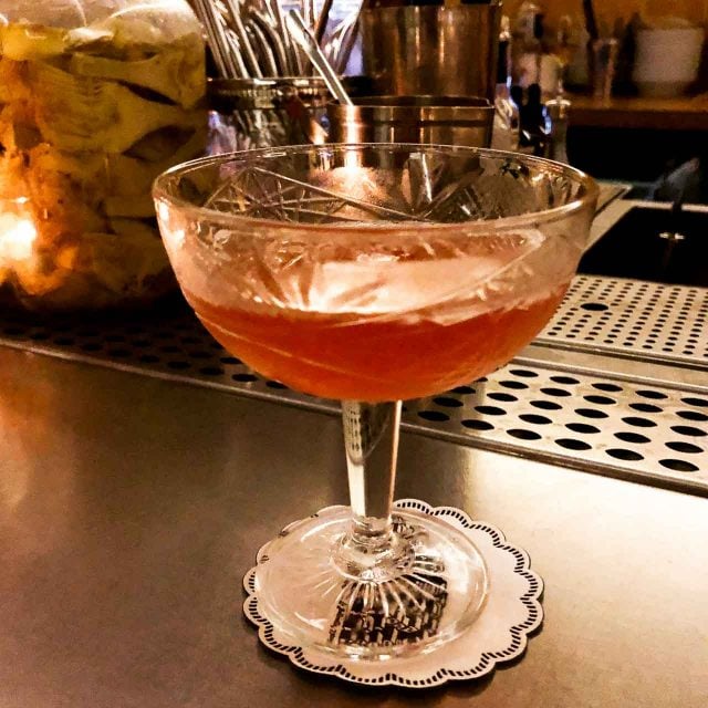 Combat may seem like an unusual name for a Parisan bar (in my next book, I explain why), but you donโt need to know why right now, you just need to go to what is one of my favorite cocktail bars in Paris. The drinks arenโt over-the-top (thank youโฆ) but straightforward, and delicious. For some reason, the bar height and size works perfectly for me; I always feel like Iโm dining (or drinking) in someoneโs home, rather than in a bar. The cocktail I prefer is the Perfect Serve, above, with whiskey, dried pear, sherry, ume liqueur, and a touch of absinthe. The name is spot-on.