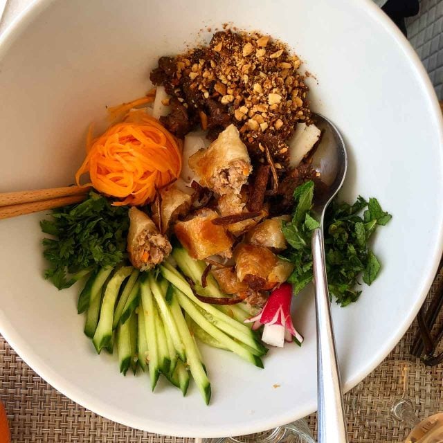 Yup, I know itโs not called Bo Bun, but thatโs what they call it in France. (And yes, in France, itโs also cafรฉ express, not an espresso.) If you have a problem with the language, take it up with the Acadรฉmie Franรงaise. Whatever you call it, Bo Bun has become as popular at the Apรฉrol Spritz around town, especially with the twenty-something set. But the one at Lux Cafรฉ (73, rue Saint-Maur, no website) is different than others. The grilled rolls and pork (although itโs available with fried tofu, and yes, with grilled pork the dish is traditionally referred to as Bun Cha) are on a bed of curled up sheets of noodles, rather than the traditional strands of vermicelli.