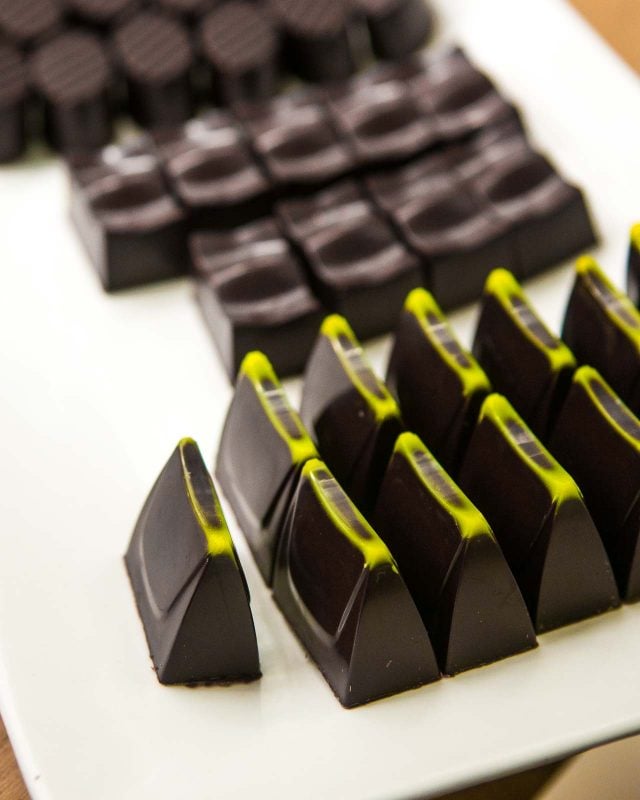 Almost everything in Andresโ chocolates is organic and vegan, except the chocolate from Venezuela, because Andres told me, โthey donโt have an organic certification there.โ Fillings for the chocolates are made with ground nuts, rather than cream.