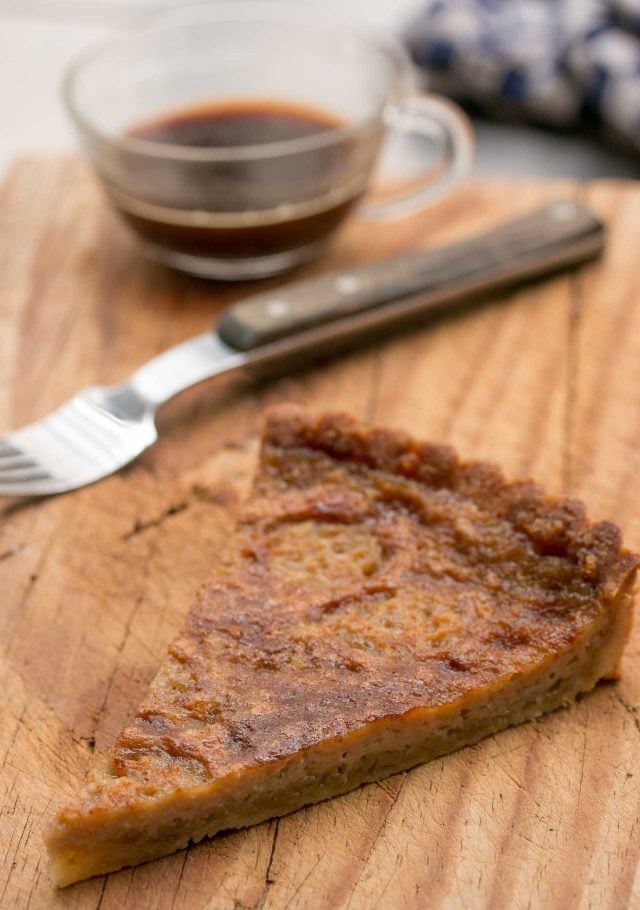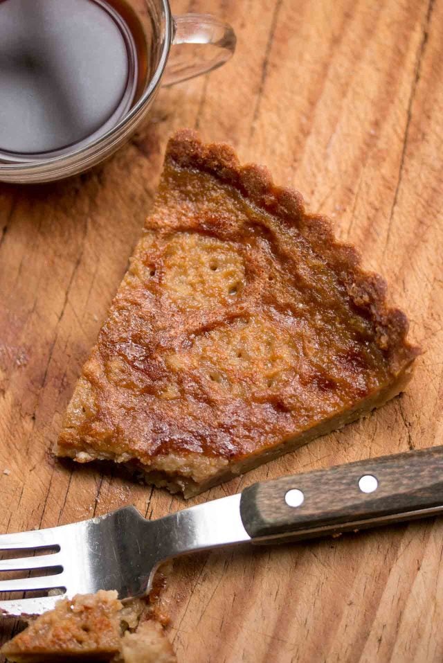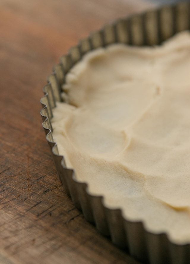 Afterย I made itย home and changed my clothes (and now have a permanent scar from when my waistband viciouslyย flew open when I released the top clasp to my trousers), I did some scouting around and learned that the tart hails from the Nord-Pas-de-Calais region, once under Flemish rule, and a region where both beer and brown sugar are popular. I noticed every recipe I came across was nearly identical, with some variations, and got to work on one to share, starting off by pressing homemadeย pรขte sucrรฉe pastry dough into a tart mold to bake.