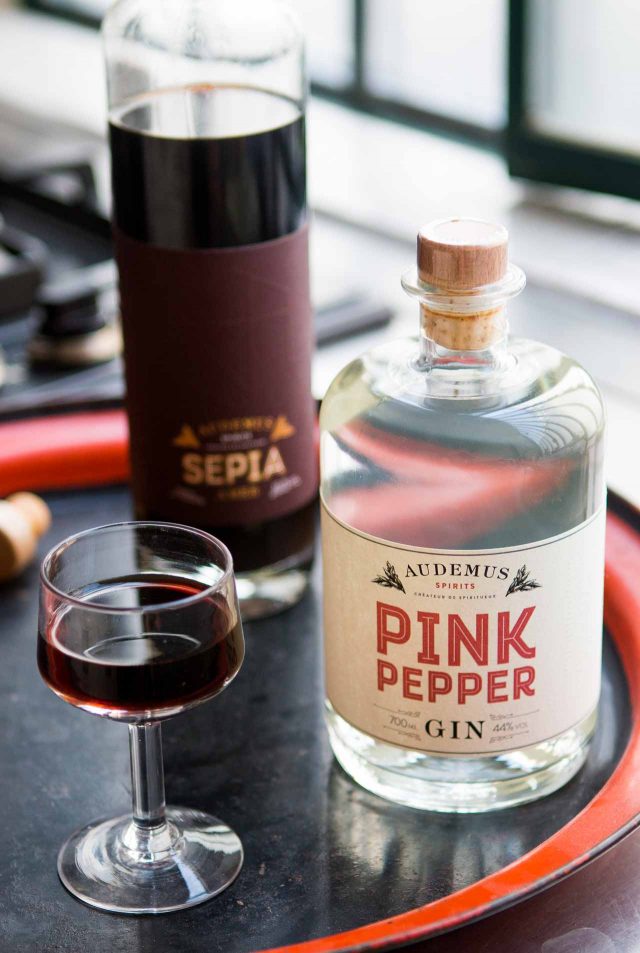 David A. Embury says in The Fine Art of Mixing Drinks that itโs probable that honey was added in the creation of the drink at the time to improve the taste of bathtub gin. Fortunately gin these days is a lot better and in France, gin has become an art form with lots of people making, and discovering, gin. Audemus has done an admirable job with their Pink Pepper gin, which Iโm happy to add to my liquor shelf next to my treasured bottle of Sepia Amer.