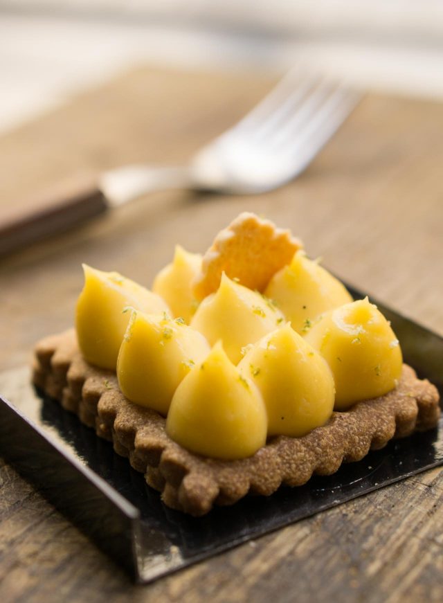 The chocolate millefeuille was gorgeous. Shatteringly crisp puff pastry sandwiching ripples of bittersweet chocolate ganache made quite the presentation. We wanted a little more intensity to the chocolate, which was dark, rich and smooth, however, it was perfectly balanced for local palates, that tend to favor an equilibrium of those three qualities. The tarte au citron was nine tangy drops of lemon cream arranged atop a salted butter sablรฉ, was another nod to chef Castelโs Breton Breton roots. The people in Brittany make good use of salted butter in their pastries and desserts, and this was no exception.