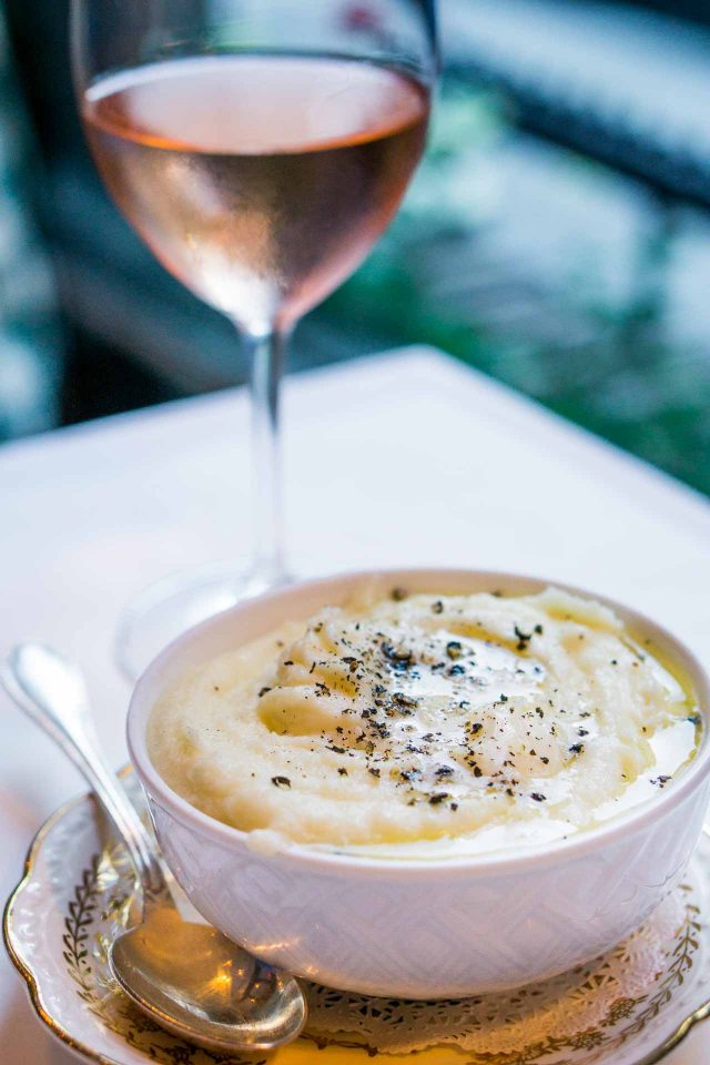 Speaking of things beloved in France, the silky, sinful butter-enriched mashed pommes purรฉe, which are subtitled โthe best mashed potatoesโ at Bistro Pierre Lapin, certainly were. A very hot pot of purรฉe PDTย (shorthand for pomme de terre purรฉe) came to the table that was rich and rife with butter, and probably some cream, topped with cracked black pepper, which is Romainโs new favorite condiment. (I like it, but he wants to put it on everything, and this bistro agrees.)