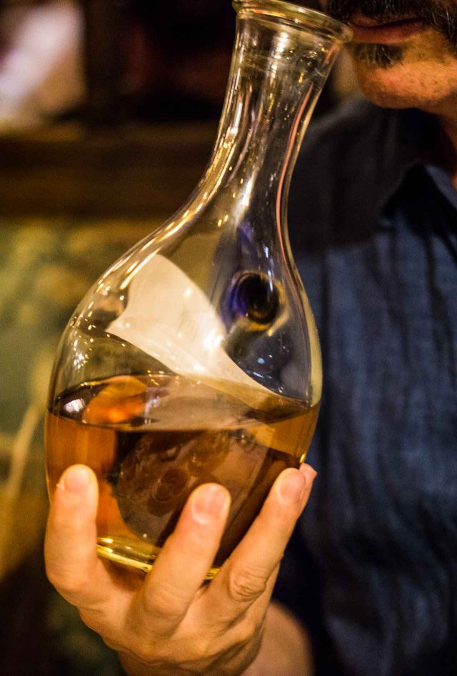 We finished off with glasses of Calvados, which Julia insisted we try. Being a Francophile, sheโs collected some impressive French liqueurs and spirits behind the bar, and I was happy to taste this French apple brandy with an apple in the bottle. The bottle is placed over the branch of the tree and the apple grows in it. Once itโs matured, the apple is snipped from the tree and remains in the bottle, which is filled with Calvados.