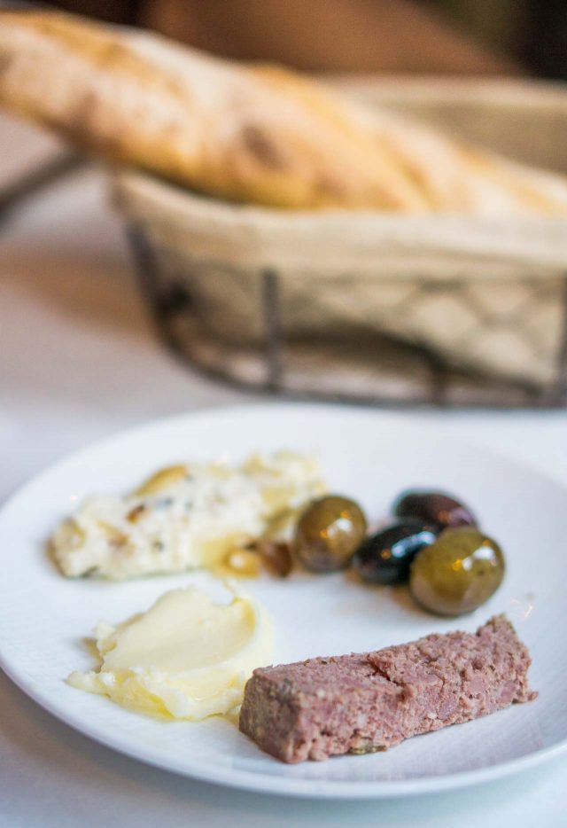 To nibble on with our drinks, they brought out a small bite of pรขtรฉ made by the chef, served with a housemade baguette that was still warm, with a few olives and a smear of excellent butter.
