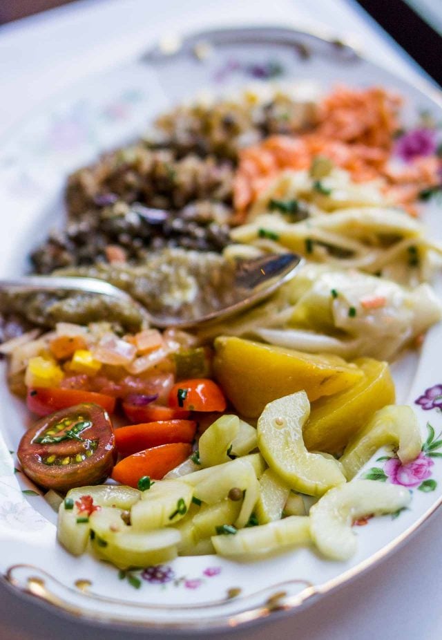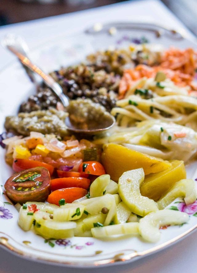 Our favorites were the French classics; grated carrot salad, green lentil salad, and smoked eggplant caviar. I like the idea of such a bountiful plate of vegetables, but in France, youโd likely only get three salads on a plate (there might be exceptions, of course), but Iโd rather focus on just a few salads rather than a lot of them all at once. But it was hard to argue at how beautiful they all looked together.