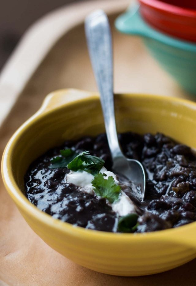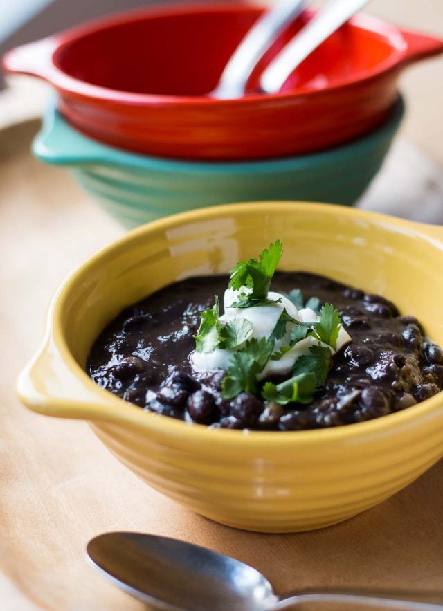 When I was leafing through ยกCuba! โ Recipes and stories from the Cuban Kitchen, I was reminded how much I like black bean soup. In theory, black bean soup is just a dark bowl of beans and doesnโt sound all that exciting. Which is probably why I hadnโt made it in a while. Also black beans arenโt that easy to come by in France. There are lots of wonderful beans in France โ haricots Tarbais, flageolets, and haricots de Soissons, but the cultures (and cuisines) that use black beans donโt necessarily skew with French cuisine, hence their paucity.