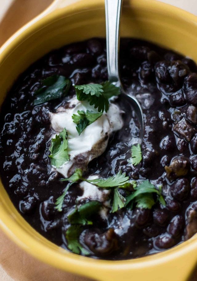 Black beans have a particularly rich flavor, much more so than others beans, and lend themselves to being paired with ingredients that have a lot of pizzazz, like peppers, tomatoes, cilantro, and tangy sour cream. You have to dig a little deeply to find them, so I was grateful when I was on book tour and someone handed me a bag of Rancho Gordo black beans. (Thanks to the woman who gifted them to me!) When I got home, I couldnโt wait to use them. Iโd been looking for a reason to revisit this soup, thatโs a favorite of mine, and here it was โ or is.