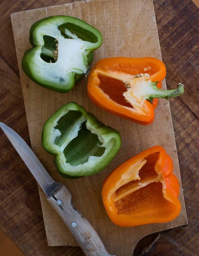 One thing I donโt love, though, is green peppers. But the flavor is important for the soup, so I took one (but not two) for the team, and used one green and one orange bell pepper, to split the difference.