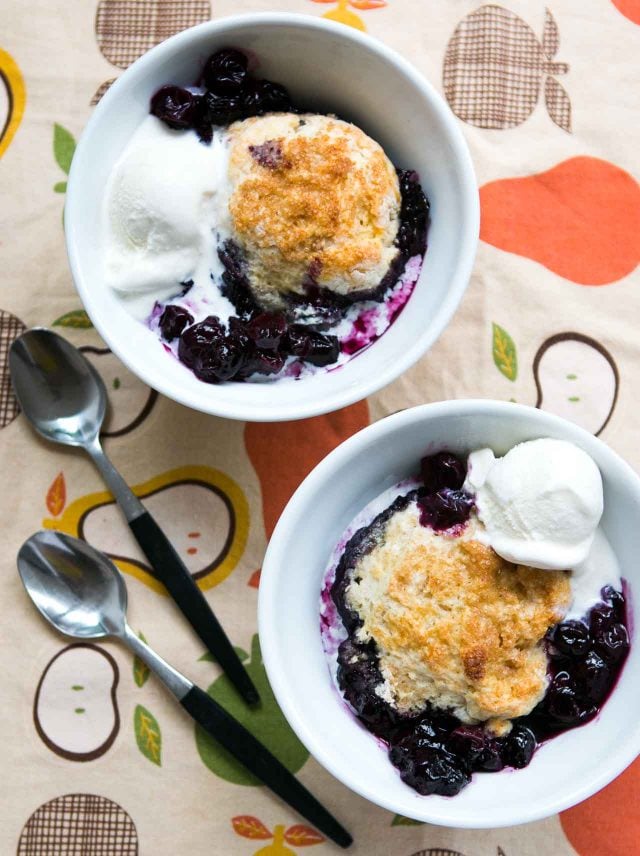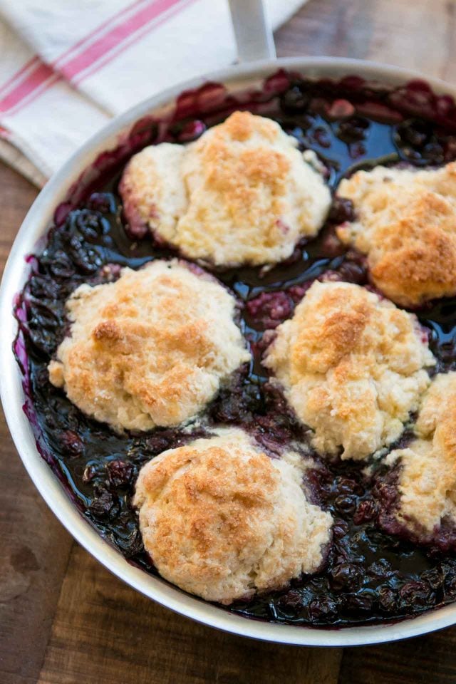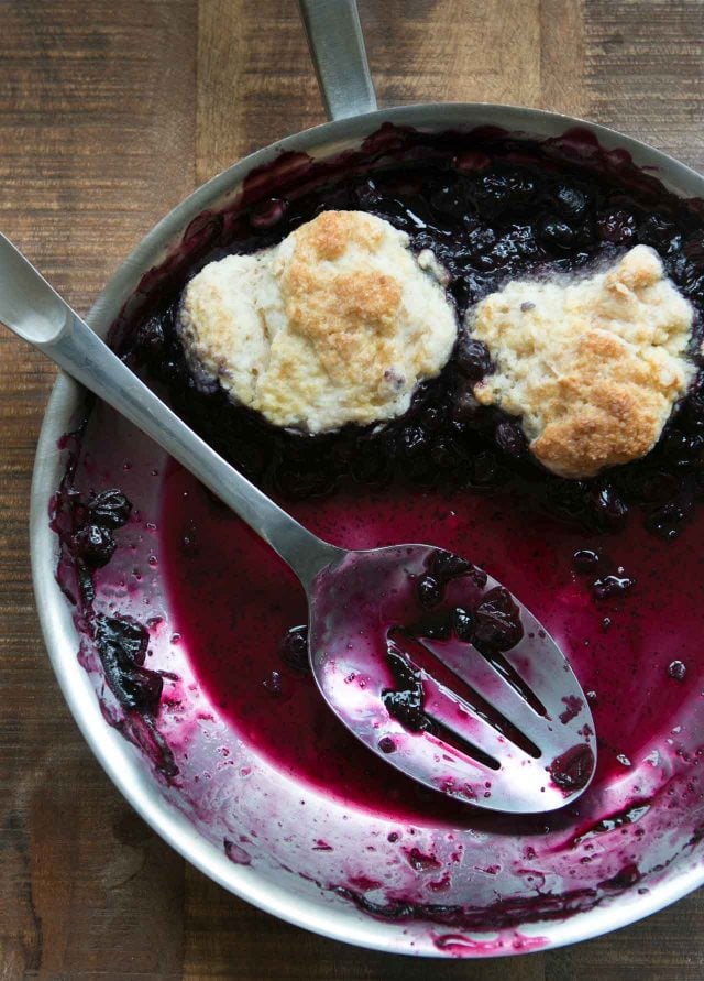 Cooking away from home often means you have to be a little more inventive. I scurried around the kitchen I was baking in and found that all the gratin dishes were already in service. So I pulled one of the saute pans off the shelf, and used that. The result was a bubbling skillet of berries, which got served with melting scoops of vanilla ice cream for dessert. But donโt be shy about eating leftovers the next day for breakfast. You can either rewarm the cobbler and biscuits in a low oven, or if youโre anything like me, you can spoon it up right from the pan, if you just canโt wait.