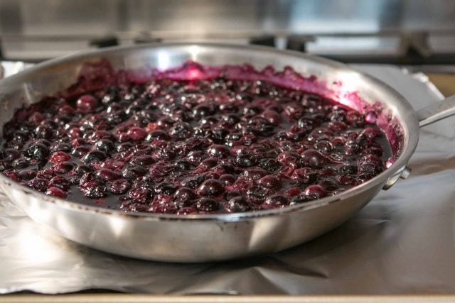 - To make the blueberry filling, mix the blueberries in a 10-inch (23cm) skillet or baking dish with the granulated and brown sugars, cornstarch, lemon zest and juice, and gin. Place the pan on a foil or parchment-lined baking sheet (to catch any spills), and bake until the berries start bubbling, stirring once midway during baking, about 30 to 35 minutes.