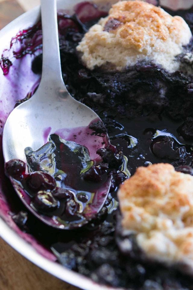 - Drop the biscuit batter over the warm cooked blueberries in six dollops, evenly spaced apart. If you want smaller biscuits, you can drop it in eight dollops.