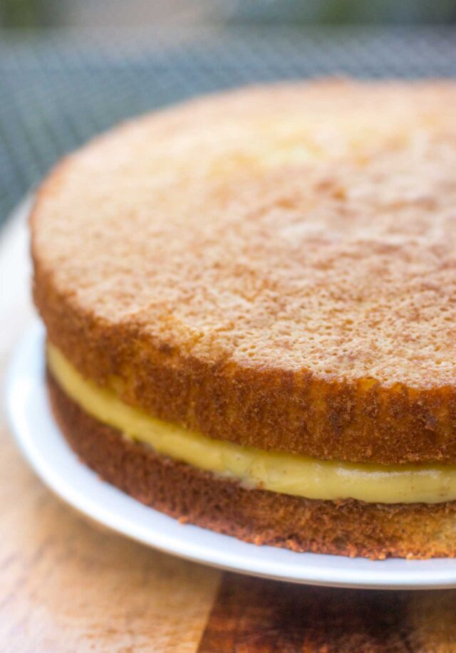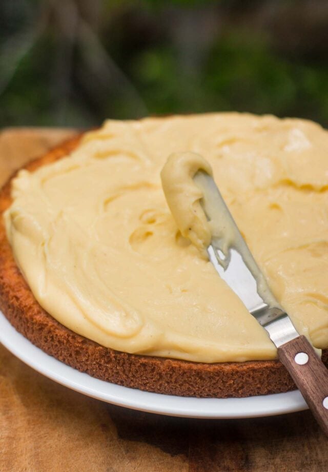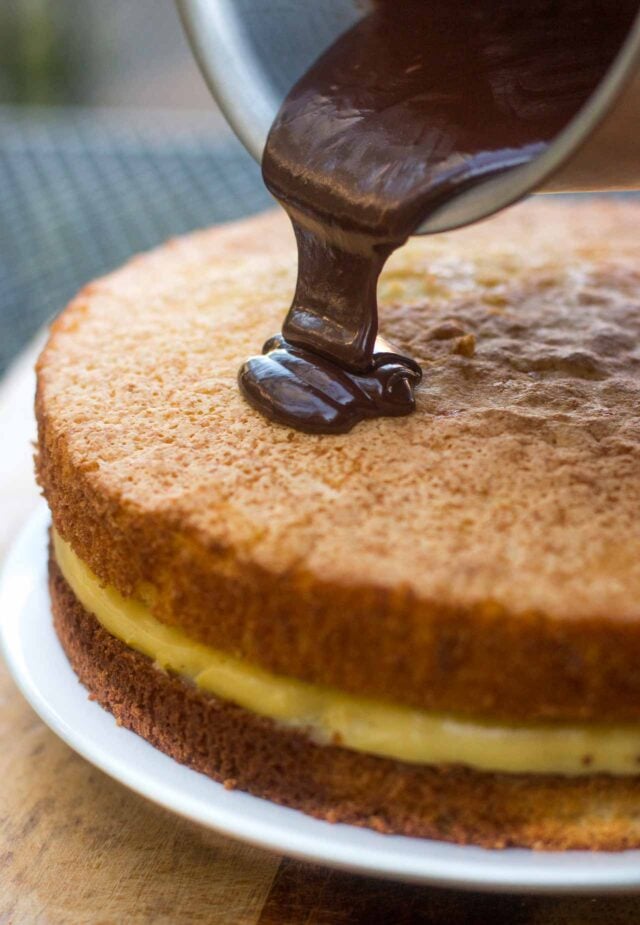 - Run a knife around the cakes to remove them from the cake pans and peel off the parchment paper. Put one round of cake on a serving plate. Remove the custard filling from the refrigerator, which likely has stiffened up, so give it a few good stirs with a whisk or spatula to loosen it up and remove any lumps. Spread it over the top of the cake on the plate. Top with the second round of cake. Chill the two-layer cake while you prepare the glaze.