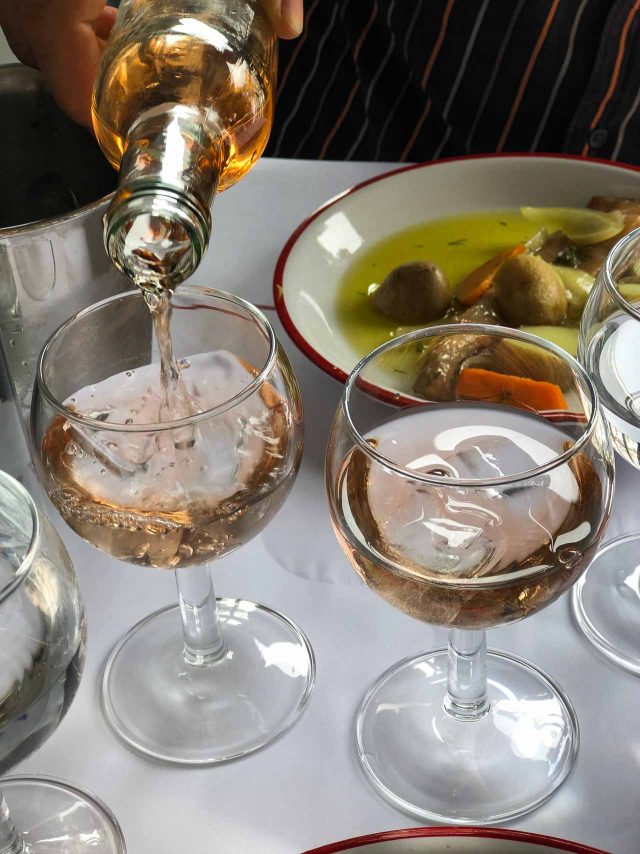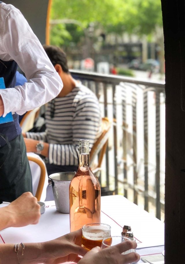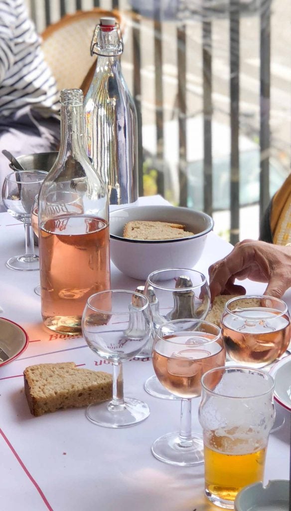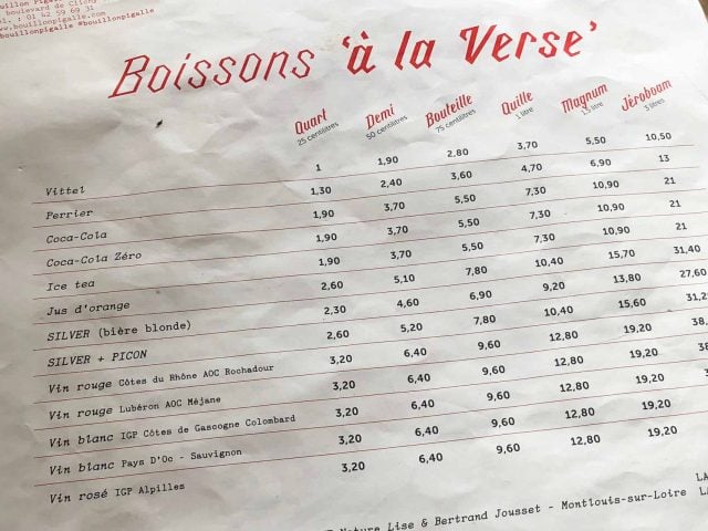 While Romain was more prudent and had a glass of the sparkling rosรฉ, wine, beer, and soft drinks are sold โby the pour,โ from 25cl (8 ounces) to Jรฉraboams (3 liters). One thing I always miss when I travel outside of French, especially in the States, is a lack of restaurants serving drinkable house wine by the carafe. Sometimes I just want one-and-a-half glasses of wine, if Iโm by myself, or a small pitcher, if thereโs two of us, if weโre not up for a whole bottle. And I donโt need a $16 (plus tax, and tip) glass of wine at lunch. Iโm fine with a glass of vin maison, at a reasonable price.