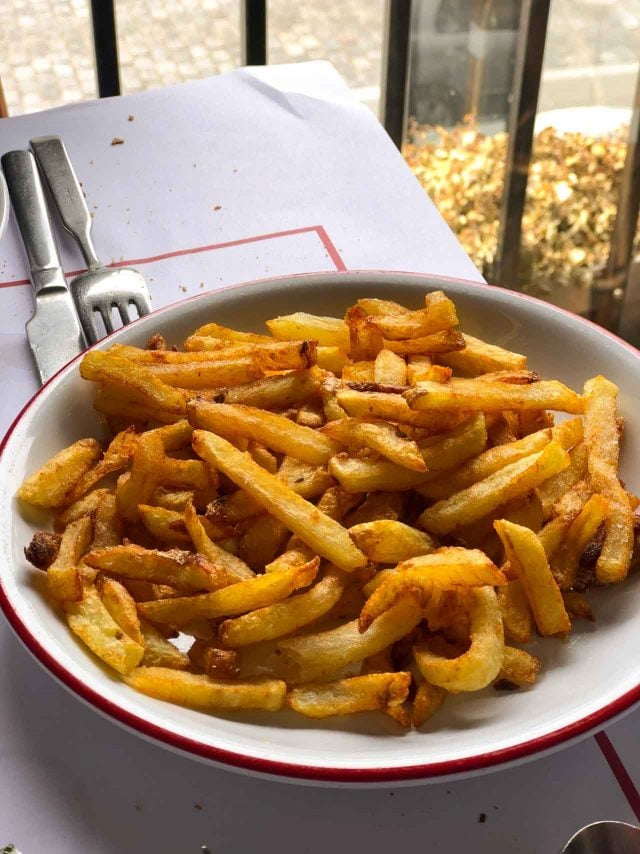 Two young women at the neighboring table had swirly bowls ofย Glace au lait frais (fresh milk ice cream), which I think is the way to go here. You can get add-ons, like chocolate, caramel or hazelnuts, for 50 centimes extra, and Iโd probably spring for all three. As I write this, dessert prices start at โฌ2,90 and none are over โฌ4,50. (But prices can change.)