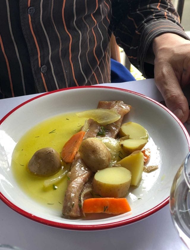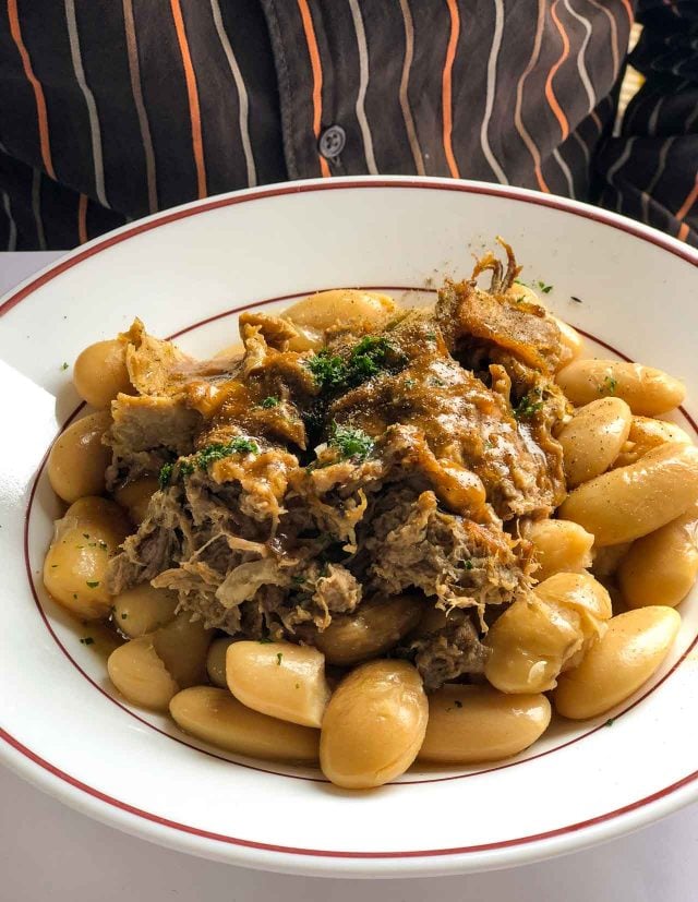 Romain loves lamb, so he went with the long-cooked agneau served with a generous amount of beans. I went with Pot au feu, boiled beef and vegetables, with was terrific, although I (and it) was missing the traditional accompaniments of mustard, coarse salt, and cornichons. I wasnโt sure if they donโt normally offer them, because the waiter seemed a little surprised that I asked, but he quickly brought them over.