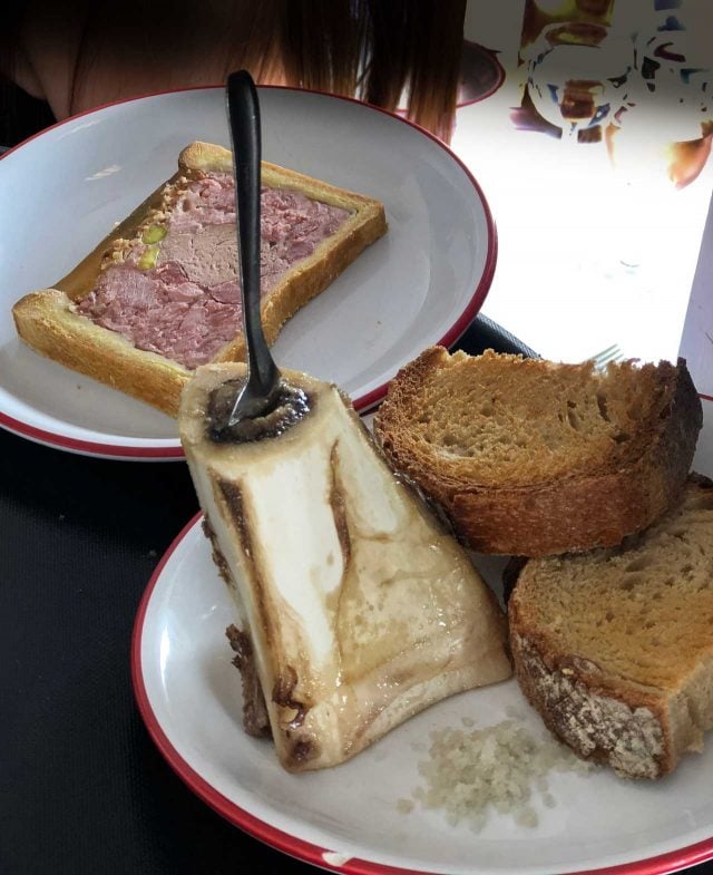 The menu ticks many French bistro classics, including herring marinated in olive oil with pickled carrots and potatoes, a slab of pรขtรฉ en croute, and beef marrow served warm, withย levain bread. Note that the ลufs mayo clocks in at โฌ1,90, the marrow is โฌ3,90 and the herring is โฌ4,50.