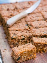 - Remove from heat and let cool completely. When cool, run a knife around the short edges of the bars in the pan (that aren't enclosed by the parchment paper) then lift the bars out and cut into squares or rectangles with a sharp knife.