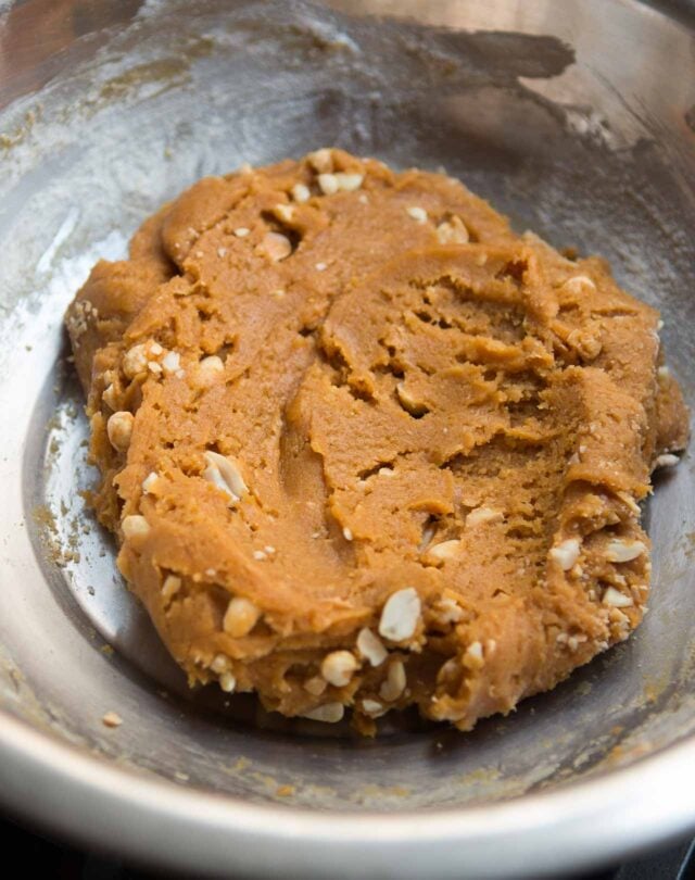 - Make the peanut butter layer by beating together the peanut butter, brown sugar, egg, and egg yolks, in a medium bowl until smooth, light, and creamy. (You can also use a stand mixer fitted with the paddle attachment.) Stir in the flour, baking soda, salt, and two-thirds of the chopped peanuts. Spread the peanut butter cookie dough in the prepared baking pan in an even layer. If using your clean hand for the task, moistening it with water or a shot of non-stick spray will help keep the dough from sticking as you pat it down.