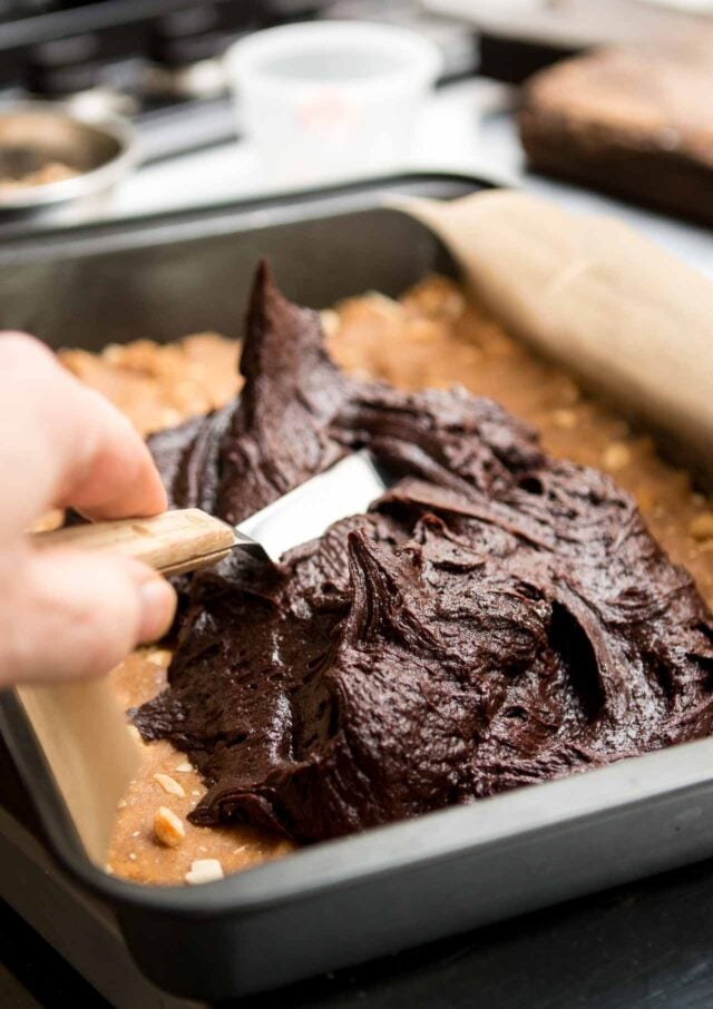 Even if the fingerprints didnโt show up in the baked bars, my fingerprints left large ridges and ripples in the peanut butter layer since it was hard to get it smooth. Looking at them now, theyโre kinda cool, but the texture wasnโt right, as Edd warned me would happen with natural peanut butter when I asked about which peanut butter to use.