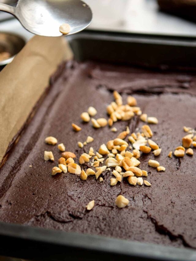 - In a large bowl, whisk together the granulated and brown sugar, salt, vanilla, and eggs until smooth and slightly pale, which'll take about 2 minutes. (You can also do this in a stand mixer fitted with the whip attachment.) Stir in the cocoa and melted butter mixture, then the flour, just until combined. Spread the brownie batter over the peanut butter layer and sprinkle with the remaining chopped peanuts.
